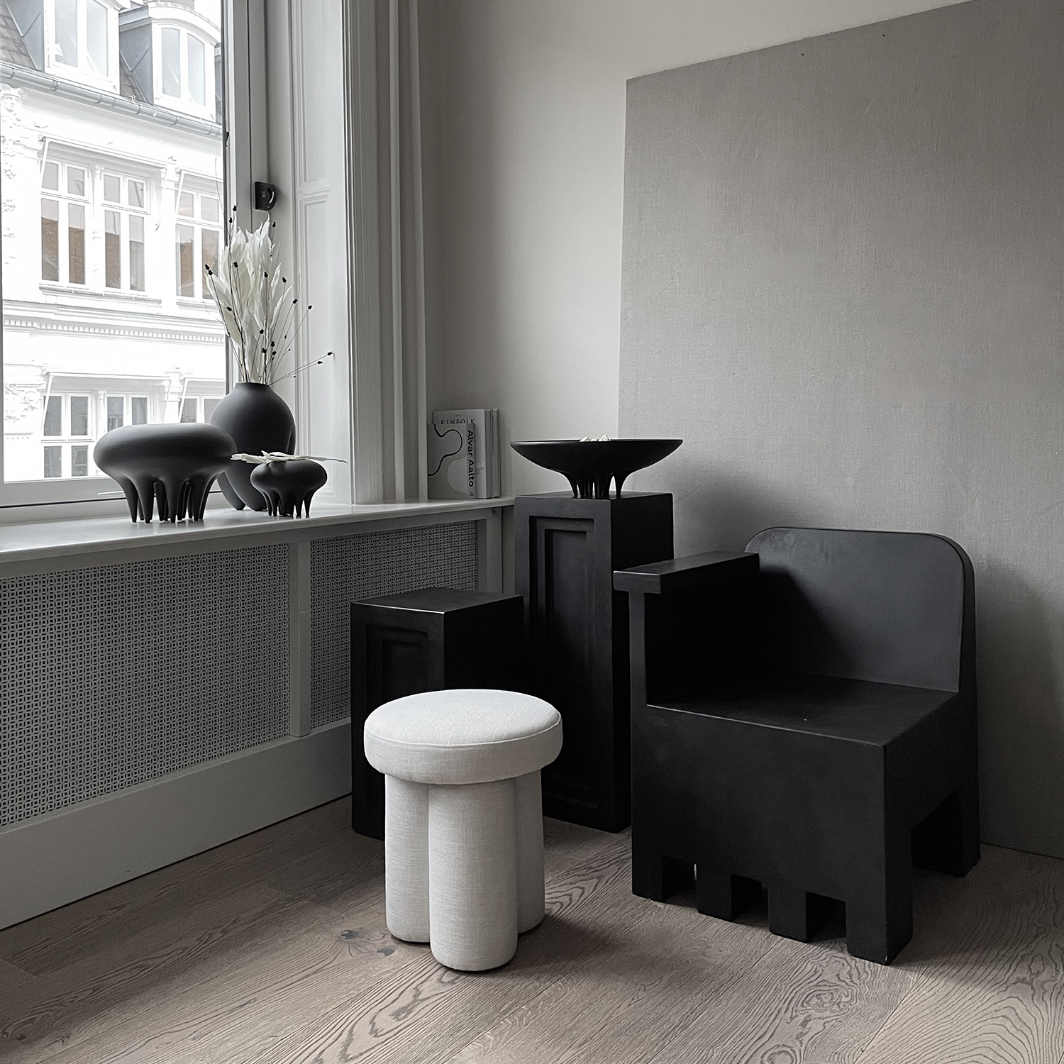 Air openings around the floor level created the impression of a set of legs, which has been used as a reference for the front legs of the Kamado Chair. A sort of asymmetry where usually found in the first ovens, which is emphasized in Kamado Chair with the one-sided armrest for an increased and relaxing seating comfort.