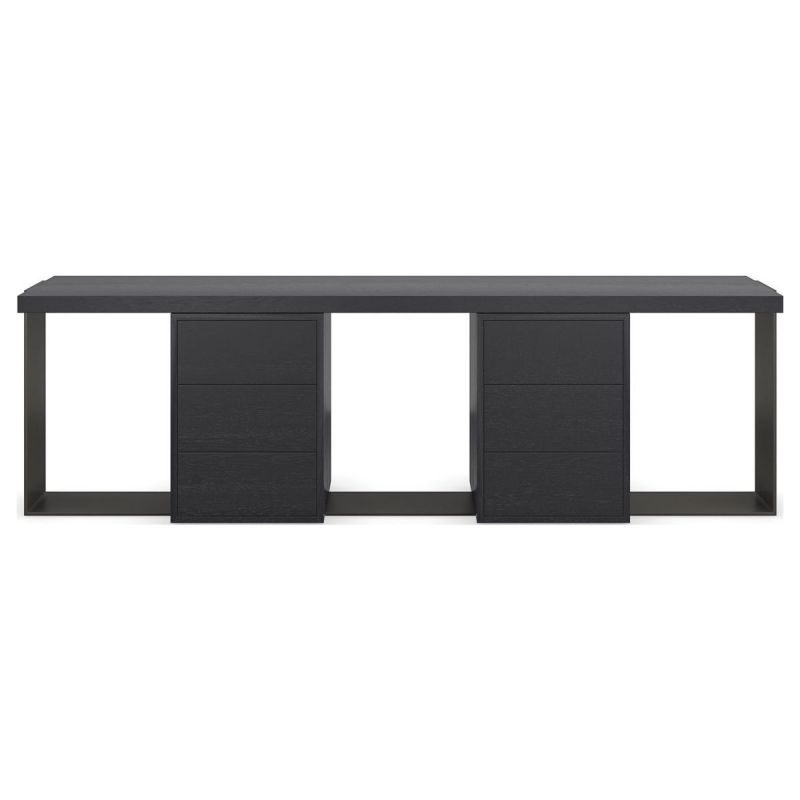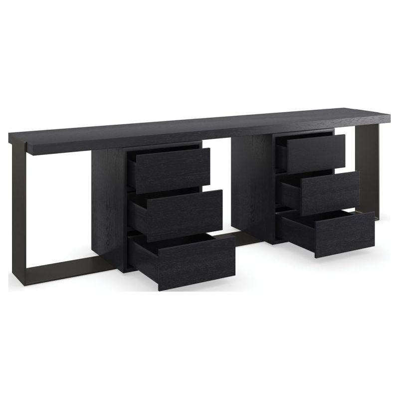 Sleek and sophisticated, this modern console makes a bold statement in spaces designed for entertaining. A clever use of negative space creates depth and dimension, punctuated by metal frame and beautifully grained veneers in a matte black finish. Features open space for creative display and storage, and six soft-close drawers for staying organized.